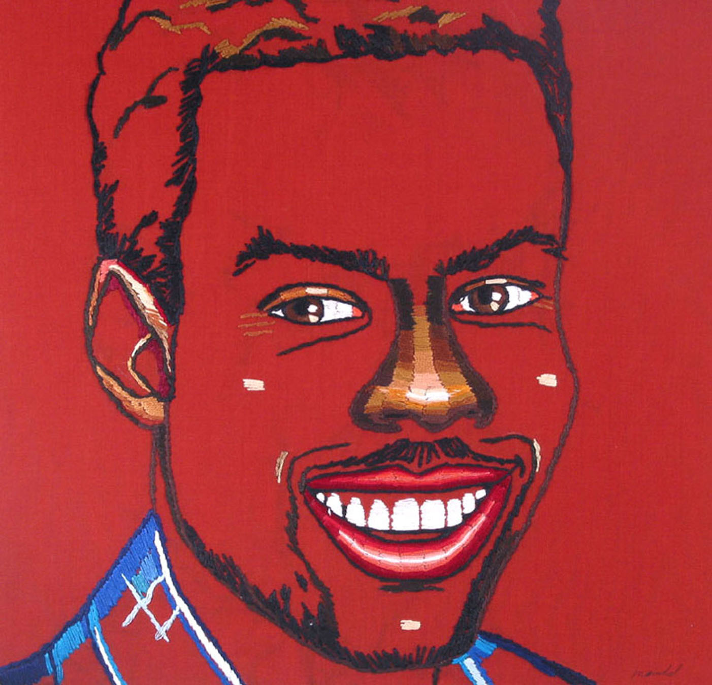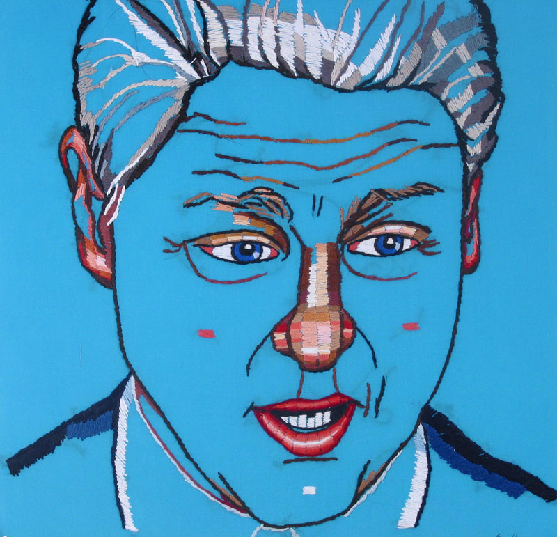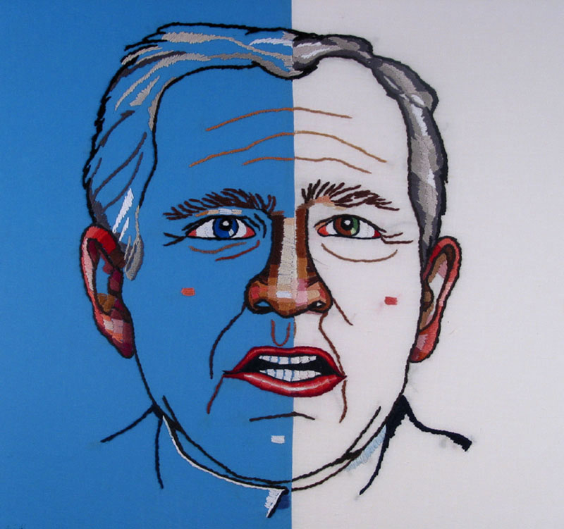Portraits excerpted from Laughing Stock (2006). Clockwise from top left: Chris Rock, Bill Murray, David Letterman, Jon Stewart, Sandra Bernhard, Eddie Murphy, Lenny Bruce, Jim Carrey, Wanda Sykes, Margaret Cho, Steve Martin, Whoopi Goldberg. Center portraits clockwise from top left: George Bush, Dick Cheney, Condoleeza Rice, Bill Clinton, Hillary Clinton Wincing. All portraits cotton, thread, 13" x 13," except for George Bush and Dick Cheney, which are 16" x 16." |