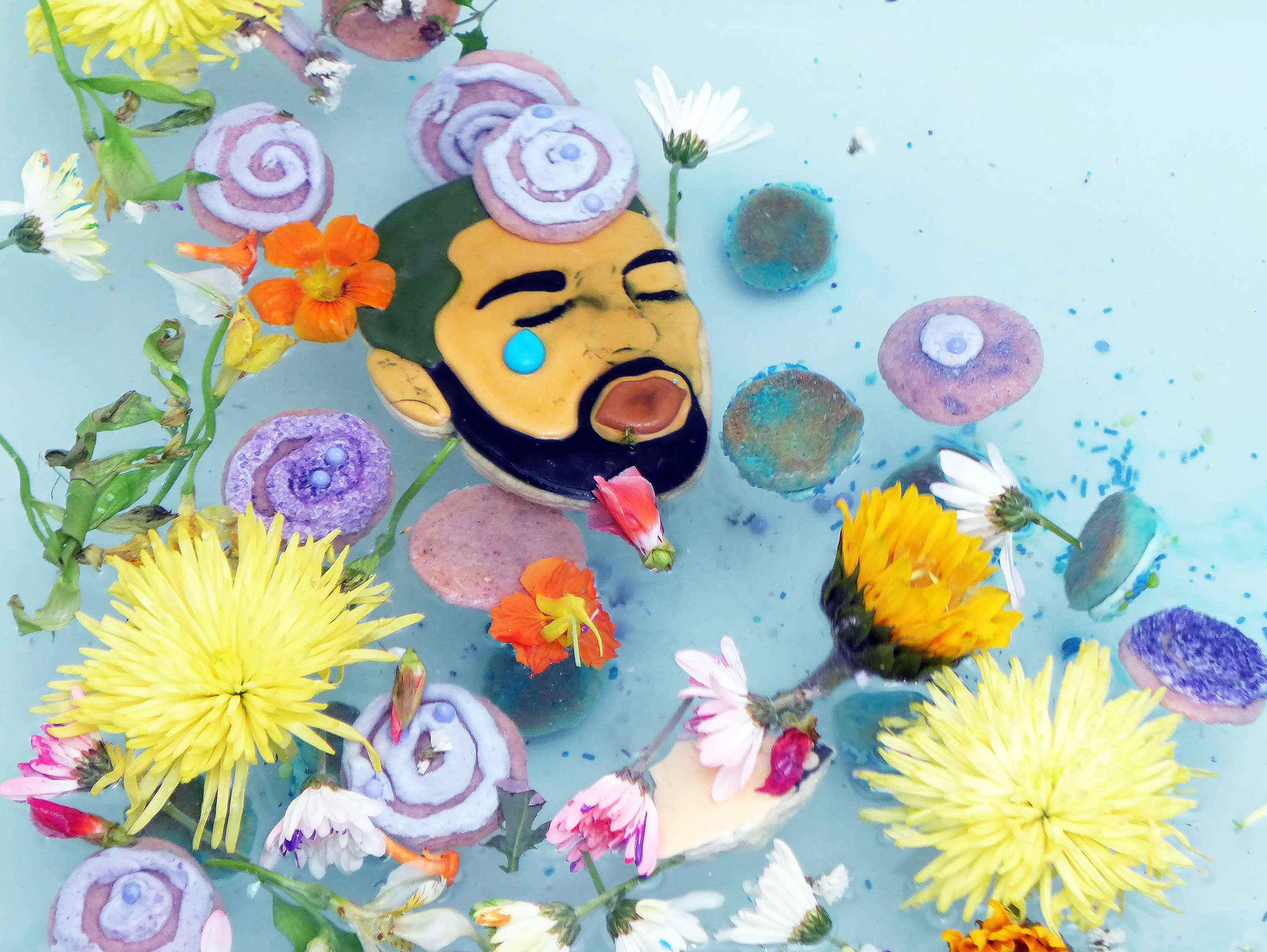 Floating Cookies (Drake), 2019. Cookies, flowers, water |